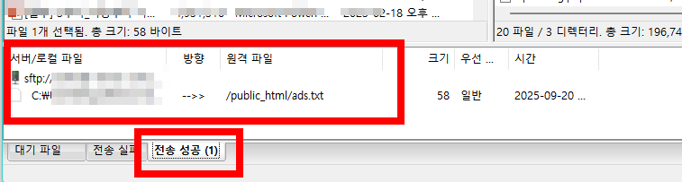 6. 파일질라하단에 전송성공이 된것을 확인