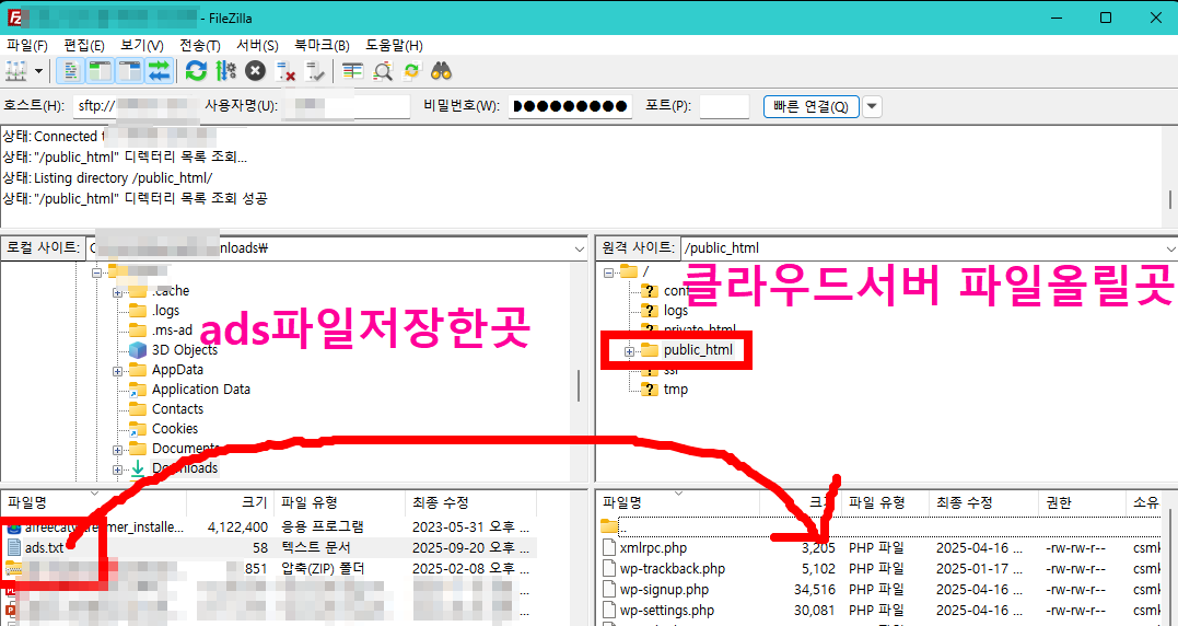 5. 내가 저장한 ads.txt 파일을 끌어서 우측 public_html 폴더 아래 파일 있는 곳으로 넣는다.