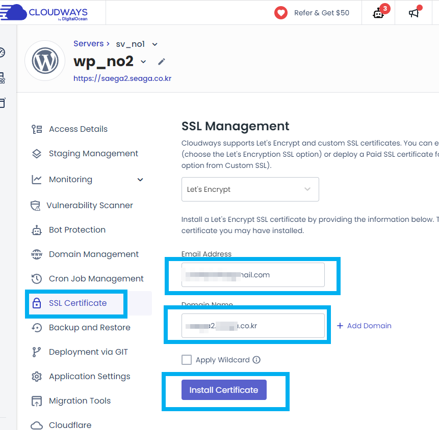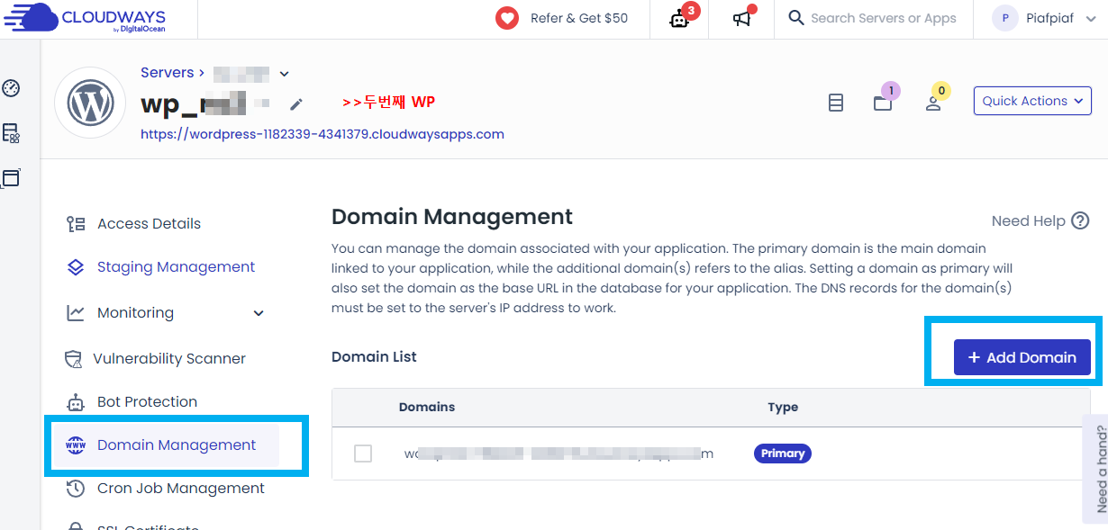 가비아 설정후 클라우드웨이즈에서 어플리케이션 추가를 합니다. 그리고 기존 메인도메인처럼, 도메인 매니지멘트, SSL certificate에 하위 도메인을 등록합니다.